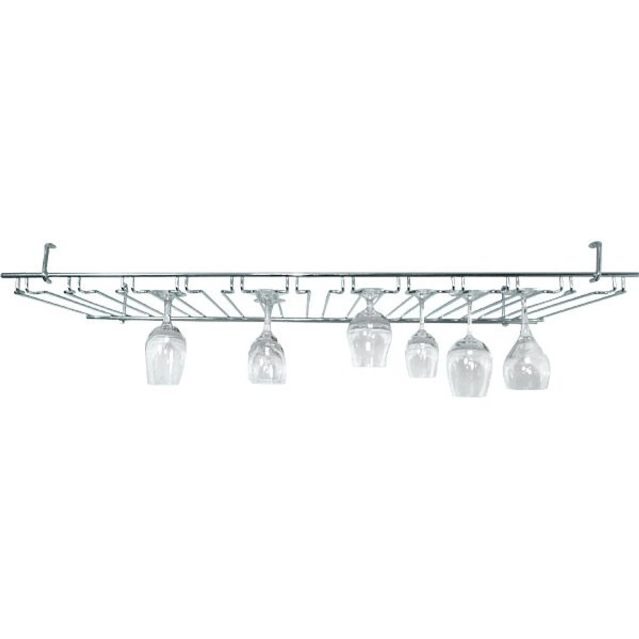 The 11-Channel Overhead Glass Rack mounts easily overhead or under cabinetry to store wine glasses, martini glasses, coupes, and other stemmed glasses out of harm’s way but within easy reach. Its exact capacity for glassware storage depends on the shape and size of your particular glasses, so you may need more than one unit to accommodate your entire stock of glassware.