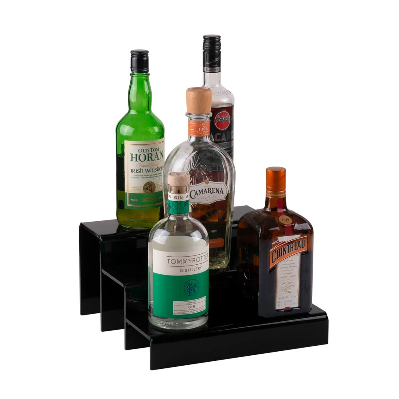 Bring some organization to your back bar with this 3 tiered liquor bottle display shelf. Made from durable black acrylic, these bar shelves will not bend or buckle, and are easy to clean. These shelves are exclusive to KegWorks and made in the USA.