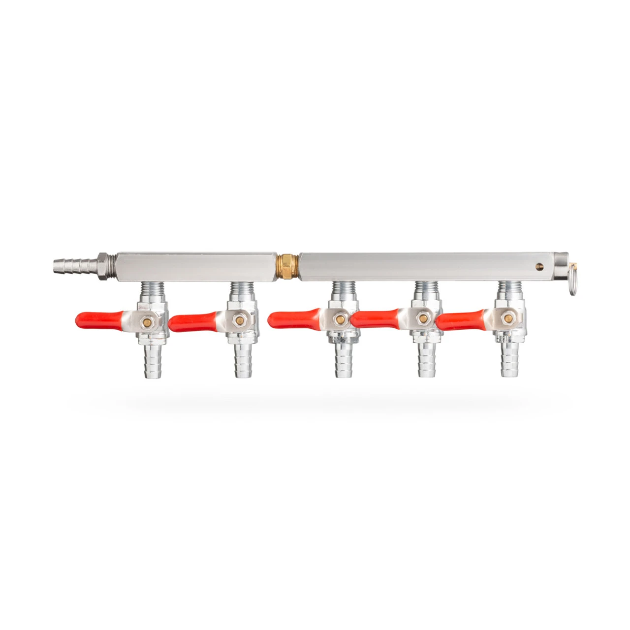 This distribution bar is used to distribute from one to 5 separate kegs. Each distributor has a shut off to turn off air distribution when not in use.