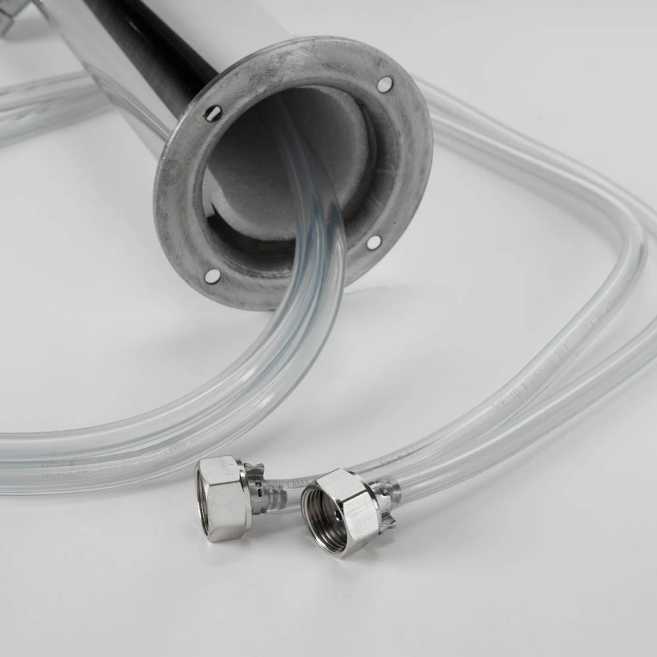 This set includes the dual tap kegerator tower, two of our sturdy black plastic tap handles, two 5-foot vinyl lines with connectors (one for each faucet), and a mounting gasket. This allows you to mount the keg tower on top of your bar, countertop, or refrigeration unit for a clean, professional setup. This setup will work for serving draft beer, cocktails on tap, or you can attach stout faucets for nitro cold brew coffee.