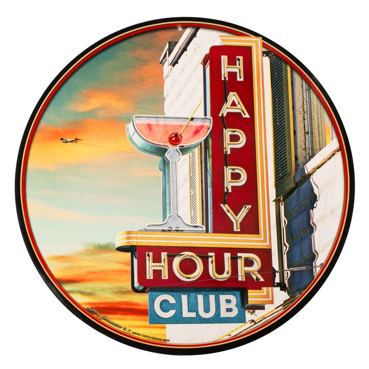 This round, 14″ stainless steel metal bar sign features the vivid artwork of Larry Grossman. The picturesque scene shows a 50’s style “Happy Hour Club” restaurant sign, a nice sunset on the horizon, and an airplane in the background.