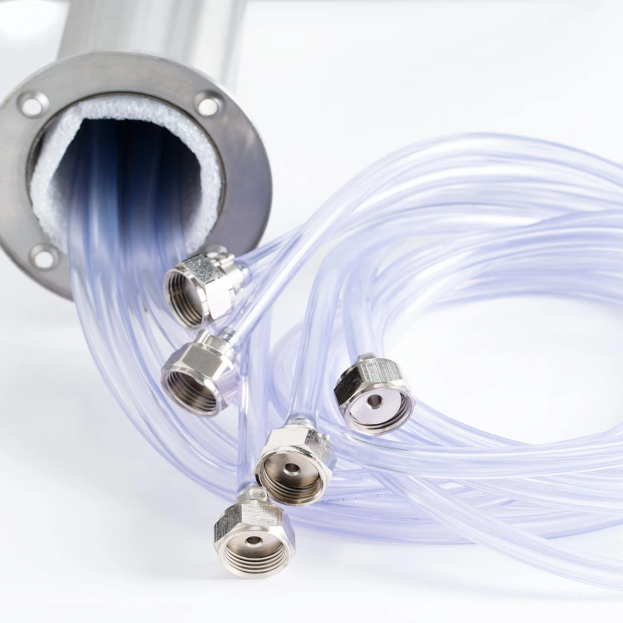 This beer tower dispenser comes with almost everything you need to install and use the tower, including shanks, hex nuts, tail pieces, five chrome-plated brass faucets with brass levers, and 6-ft beer lines with fittings, gasket, and mounting screws. The only components you’ll need to add are