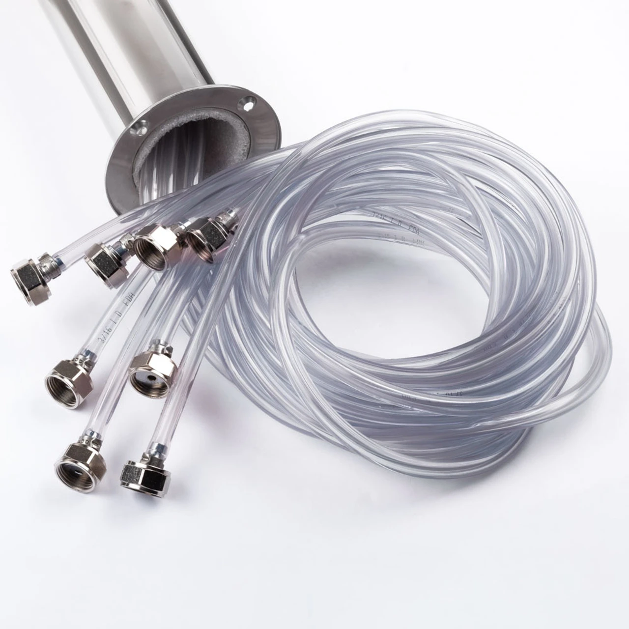 This beer tower dispenser comes with almost everything you need to install and use the tower, including shanks, hex nuts, tail pieces, eight chrome-plated brass faucets with brass levers, and 6-ft beer lines with fittings, gasket, and mounting screws. The only components you’ll need to add are