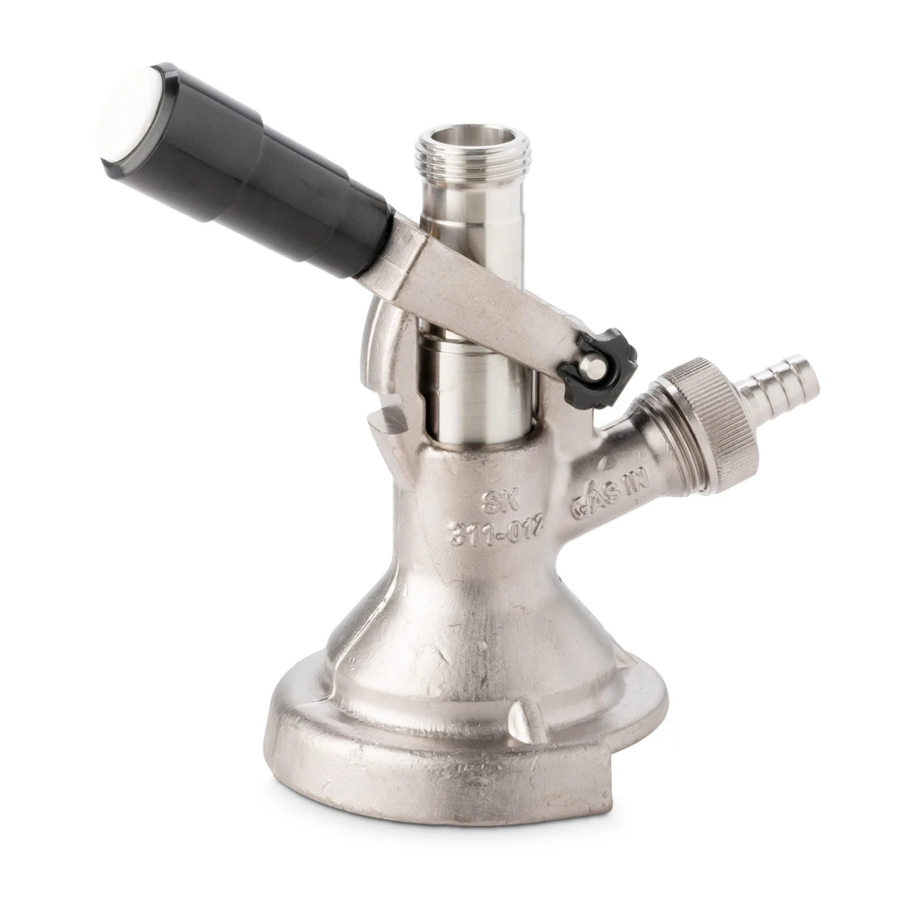 Simply put, your draft beer dispensing will be a failure without the right keg coupler. On any draft beer system, the coupler, or keg tap, allows the gas tank to supply pressurized CO2 into the keg. You attach the bottom of the coupler to the keg valve, the gas line to the side hose nipple, and the beer line on top of the coupler. When in use, the result is beer being pushed up the beer line toward the draft faucet.